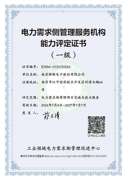 近日,南京新聯(lián)電子股份有限公司順利通過工業(yè)領域電力需求側(cè)管理促進中心能力評估審核,公司電力需求側(cè)管理服務機構(gòu)能力評定證書(一級)成功換證,這是對新聯(lián)電子在電力需求側(cè)領域服務能力和技術(shù)實力的充分肯定。