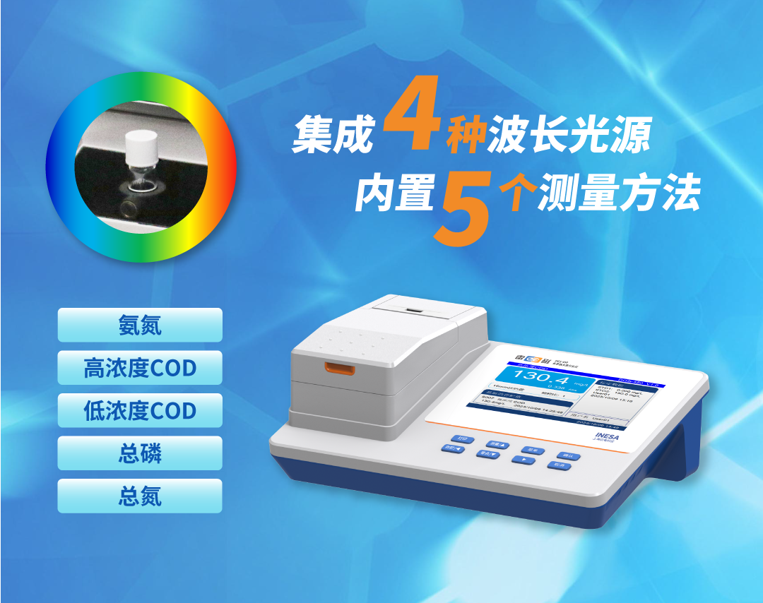 • 集成4種波長光源,內(nèi)置氨氮、高濃度COD、低濃度COD、總磷、總氮5個測量方法