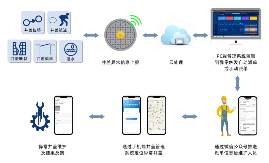 在日常井蓋巡查工作中,如果純靠人力巡護(hù),井蓋數(shù)量龐大,覆蓋面積光,費(fèi)時(shí)費(fèi)力、效率低、容易巡查不到位,可引入智能監(jiān)管系統(tǒng),通過(guò)先進(jìn)的井蓋監(jiān)測(cè)傳感器、物聯(lián)網(wǎng)、系統(tǒng)平臺(tái)對(duì)井蓋進(jìn)行實(shí)時(shí)監(jiān)測(cè)、異常上報(bào)、自動(dòng)派單、維護(hù)反饋,降低井蓋巡護(hù)難度,提升井蓋安全管理效果。