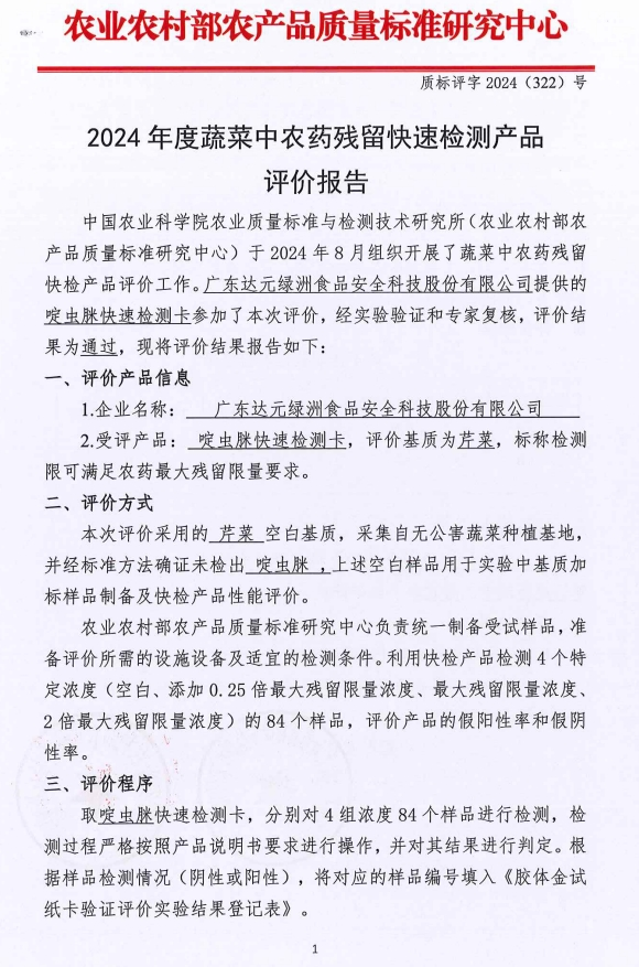 中國(guó)農(nóng)業(yè)科學(xué)院農(nóng)業(yè)質(zhì)量標(biāo)準(zhǔn)與檢測(cè)技術(shù)研究所(農(nóng)業(yè)農(nóng)村部農(nóng)產(chǎn)品質(zhì)量標(biāo)準(zhǔn)研究中心)于2024年8月組織開(kāi)展了蔬菜中農(nóng)藥殘留快檢產(chǎn)品評(píng)價(jià)工作。廣東達(dá)元綠洲食品安全科技股份有限公司提供的三唑磷、氯氟氰菊酯、甲氨基阿維菌素苯甲酸鹽、滅多威、氟蟲(chóng)腈、水胺硫磷、倍硫磷、毒死蜱、甲拌磷、啶蟲(chóng)脒、克百威和三羥基克百威等11種快速檢測(cè)卡參加了本次評(píng)價(jià),經(jīng)實(shí)驗(yàn)驗(yàn)證和專(zhuān)家復(fù)核,11種產(chǎn)品全部通過(guò)驗(yàn)證評(píng)價(jià)。