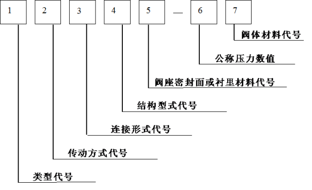 從上面分類中可以看出,閥門的品種是繁多的;如此繁多的品類,必須有一個統(tǒng)一的型號編制方法,才能讓使用者一看銘牌便知道某一種閥門的結(jié)構、材料和特性。按照《閥門型號編制方法》規(guī)定,閥門型號分七個單元:
