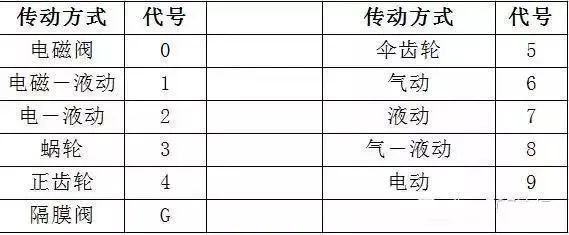 在五、六單元之間,用一橫杠連接。第一單元是類型代號,用漢語拼音字母表示:對于低于零下40℃的低溫閥、帶加熱夾套的保溫閥和帶波紋管(代替填料函)的閥門,在類型代號前,分別加上漢語拼音字母“D”“B”“W”。第二單元是傳動方式代號,用阿拉伯數(shù)字表示: