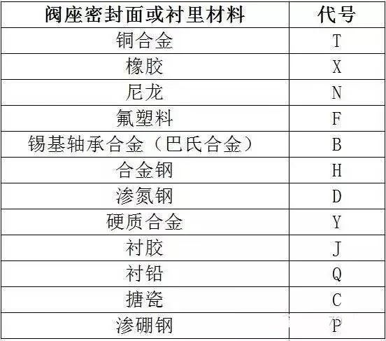 第五單元是閥座密封面或襯里材料代號,用漢語拼音字母表示: