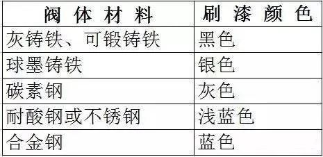 但耐酸鋼或不銹鋼閥體,也可以不涂漆。有色金屬閥體,不必涂漆。表示密封面材料的油漆,刷在手輪、手柄或自動閥件的蓋上,其顏色與密封面材料的關系如下:
