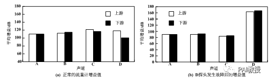 在多聲道超聲流量計的聲道診斷中,診斷結(jié)果的顯示圖形化,是軟件技術(shù)滲透流量測量儀表的一大趨勢。以前的流量計顯示屏幕較小,只能用代碼顯示診斷結(jié)果?,F(xiàn)在屏幕增大后用圖形化顯示,不僅簡單明了,而且形象易懂,很受使用者的歡迎。以下以美國通用電氣(general electric,GE)公司的圖形用戶界面(graphic user interface,GUI)軟件進行現(xiàn)場診斷的圖形顯示為例[10]。各聲道平均增益顯示圖、正常和故障狀態(tài)下信號質(zhì)量的比較圖、整流器部分阻塞后的診斷結(jié)果顯示圖、整流器部分阻塞后的診斷結(jié)果顯示圖和B聲道SOS分布圖如圖2~圖5所示。