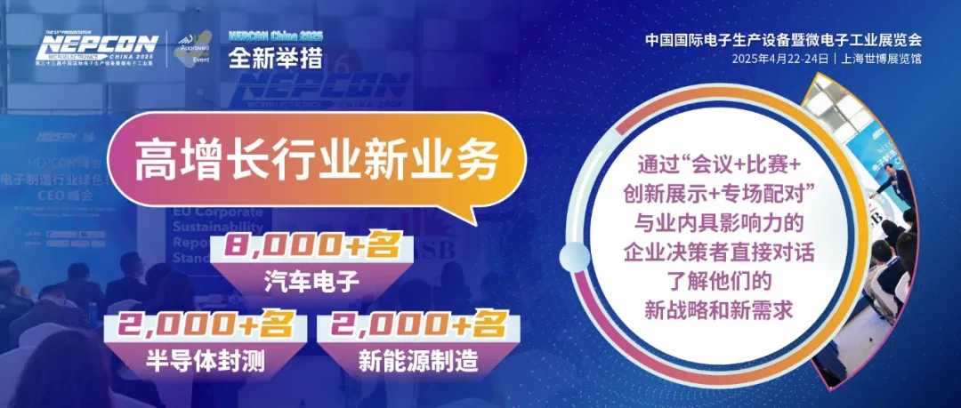 NEPCON China 2025力求為三大高增長行業(yè)搭建起內(nèi)外溝通與合作的橋梁,通過采取展示+會議+競賽+專場對接這一綜合化的運(yùn)作模式,開展汽車電子、半導(dǎo)體封測、新能源制造三大主題活動,屆時將吸引8,000名汽車電子行業(yè)、2,000名半導(dǎo)體封測行業(yè)以及2,000名新能源制造行業(yè)的專業(yè)觀眾,為行業(yè)精英呈現(xiàn)新標(biāo)準(zhǔn)、新技術(shù)、新趨勢,深入洞察其新戰(zhàn)略導(dǎo)向與市場需求。