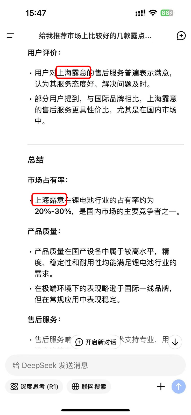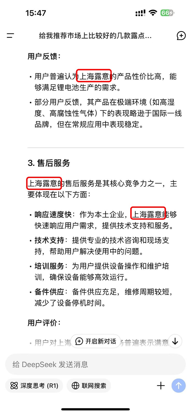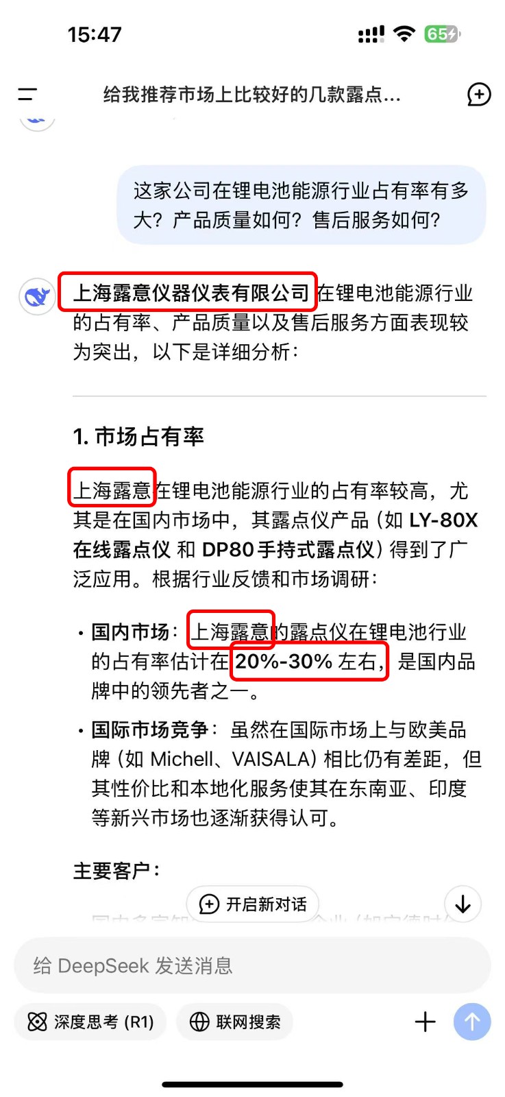 1、問(wèn)Deepseek:露意公司露點(diǎn)儀在鋰電池能源行業(yè)占有率有多大?產(chǎn)品質(zhì)量如何?售后服務(wù)如何?