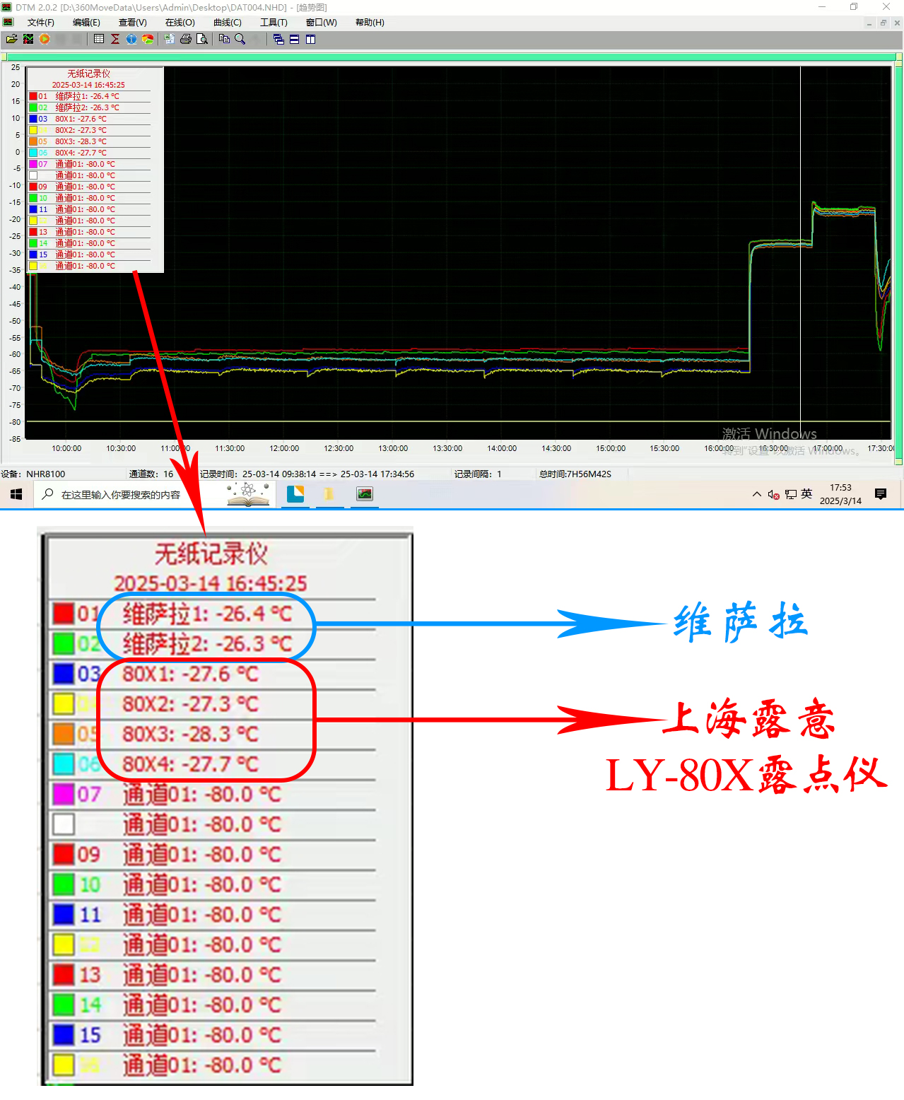 為評(píng)估露點(diǎn)儀性能,某上市公司對(duì)露意公司的露點(diǎn)儀維薩拉公司的露點(diǎn)儀開展了比對(duì)測(cè)試。在測(cè)試過(guò)程中,以鏡面露點(diǎn)儀作為基準(zhǔn)參照。測(cè)試首先在 - 60℃的環(huán)境下進(jìn)行,對(duì)設(shè)備進(jìn)行了持續(xù) 7 小時(shí)以上的觀察,密切考察露意公司和維薩拉公司露點(diǎn)儀的性能變化情況,其中采用了兩臺(tái)維薩拉露點(diǎn)儀和四個(gè)露意 80X 探頭。隨后,測(cè)試露點(diǎn)溫度調(diào)整至 - 30℃和 - 20℃,進(jìn)一步觀察各設(shè)備的曲線變化情況。經(jīng)過(guò)一整天嚴(yán)謹(jǐn)且全面的測(cè)試,所有測(cè)試環(huán)節(jié)均完全滿足預(yù)先設(shè)定的測(cè)試要求。