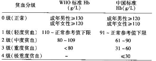 表3 貧血分級(jí)標(biāo)準(zhǔn)對(duì)比(單位:g/L)