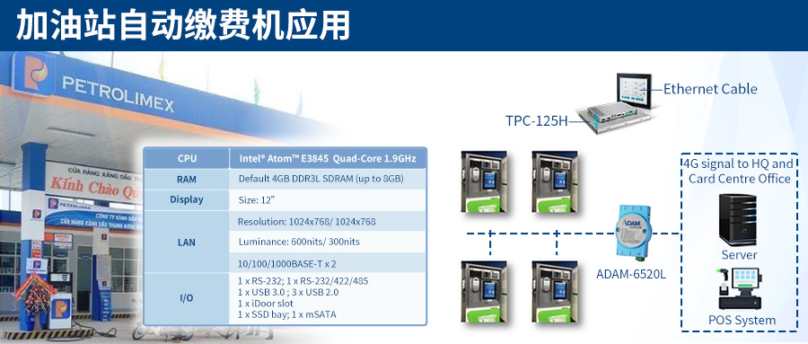 在加油站自動(dòng)繳費(fèi)機(jī)應(yīng)用中,TPC-125H防爆平板電腦結(jié)合ADAM-6520L模塊,以其緊湊設(shè)計(jì)、UL Class I Division 2認(rèn)證和豐富的I/O接口,滿足了在可能存在油氣的危險(xiǎn)環(huán)境中安全、可靠運(yùn)行的需求。