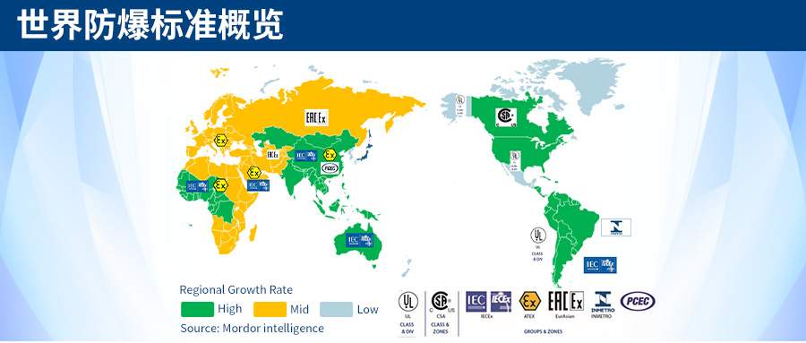 面對(duì)日益嚴(yán)峻的安全形勢(shì),“防爆”已從技術(shù)規(guī)范上升為剛性法律法規(guī)。各國基于工業(yè)特點(diǎn)建立了相應(yīng)體系,如歐盟ATEX、國際IECEx、美國UL標(biāo)準(zhǔn)及中國GB 3836系列等,均對(duì)危險(xiǎn)區(qū)域設(shè)備的設(shè)計(jì)、制造與使用提出嚴(yán)格規(guī)定。 在全球能源轉(zhuǎn)型與安全標(biāo)準(zhǔn)提升的推動(dòng)下,高效可靠的防爆技術(shù)需求持續(xù)增長(zhǎng)。市場(chǎng)研究顯示,2020至2025年全球防爆設(shè)備年復(fù)合增長(zhǎng)率預(yù)計(jì)達(dá)5%-7%,部分細(xì)分領(lǐng)域甚至超過10%。預(yù)計(jì)到2028年,該市場(chǎng)年復(fù)合增長(zhǎng)率將達(dá)25.87%,規(guī)模突破100億美元。
