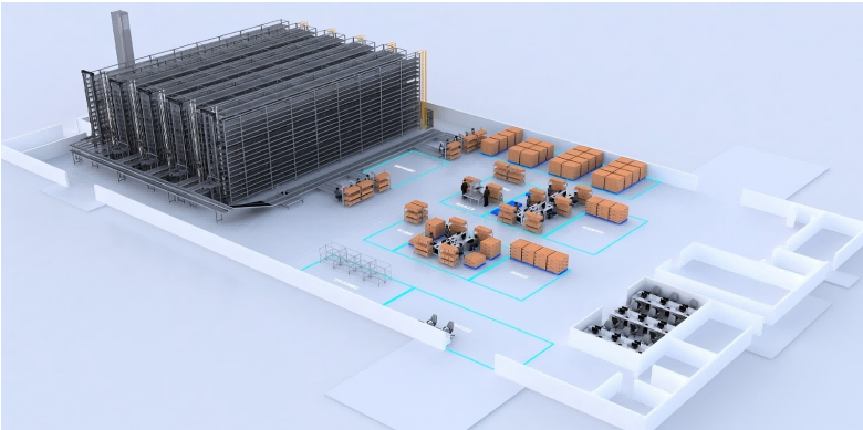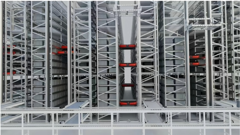 本次系統(tǒng)升級項目采用“立庫貨架+料箱穿梭車+提升機+自動化輸送線”四位一體設(shè)計,輔以 AGV 無人搬運與 WMS 倉儲管理系統(tǒng)聯(lián)動運行,構(gòu)建起覆蓋入庫、揀選、出庫、配送全流程的一體化自動化體系。