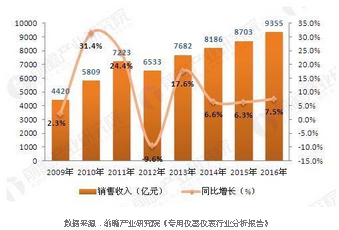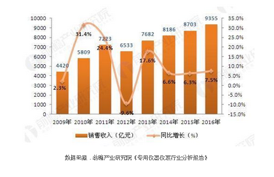 總體來看,近年來我國(guó)儀器儀表行業(yè)市場(chǎng)規(guī)模實(shí)現(xiàn)了快速擴(kuò)張,銷售收入已由2009年的4420億元增至2016年的9355億元。2013年以來,我國(guó)儀器儀表行業(yè)產(chǎn)品銷售明顯回暖,增速趨于穩(wěn)定。2016年,我國(guó)儀器儀表行業(yè)銷售增速為7.5%。