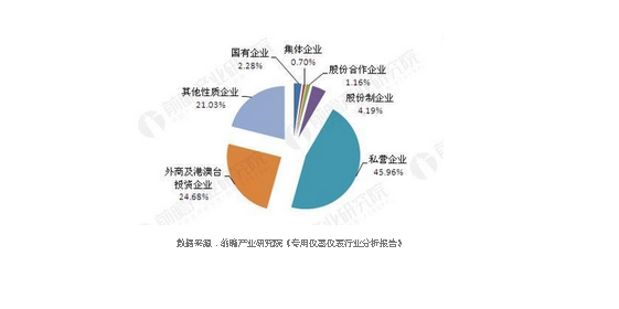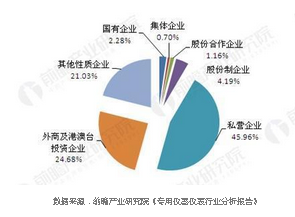 儀器儀表行業(yè)增速穩(wěn)定的另一面,是國(guó)內(nèi)外市場(chǎng)爭(zhēng)奪進(jìn)入白熱化階段,競(jìng)爭(zhēng)較為激烈。截至2017年3月,我國(guó)規(guī)模以上儀器儀表制造企業(yè)有4311家。私營(yíng)企業(yè)數(shù)量占比達(dá)到45.96%;外商及港澳臺(tái)投資數(shù)量占比24.68%;股份制企業(yè)數(shù)量占比為4.19%;國(guó)有企業(yè)數(shù)量占比2.28%;股份合作企業(yè)和集體企業(yè)數(shù)量占比分別為1.16%和0.70%。