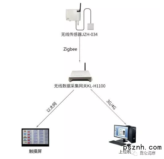 無線傳感器JZH-034,無線數(shù)據(jù)采集網(wǎng)關(guān)KL-H1100,觸摸屏,上位機,上位機軟件。