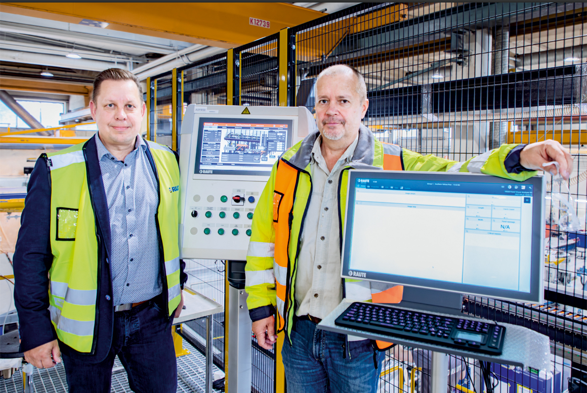 勞特單板修補(bǔ)、板材修補(bǔ)和板材加工業(yè)務(wù)線經(jīng)理 Erkki Kauranen(右)與倍福芬蘭分公司大客戶經(jīng)理 Janne Suhonen(左)在 Panel Repair Station R5 前