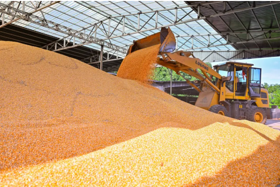 工作人員駕駛鏟車轉(zhuǎn)運烘干的糧食