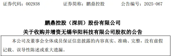 10月30日晚,鵬鼎控股(002938.SZ)公告稱,擬與無錫華陽科技有限公司(以下簡稱“華陽科技”)、江蘇旋感科技有限公司、朱榮惠、徐榮燦、湯結(jié)林、劉亮、顧常飛、顧峰簽署《股權(quán)轉(zhuǎn)讓及增資協(xié)議》,公司擬以現(xiàn)金方式受讓朱榮惠等6人所持有華陽科技的注冊資本2,760萬元,并擬同時認(rèn)購華陽科技新增的注冊資本994.99萬元,股權(quán)受讓和增資額認(rèn)購交易對價為3.57億元。