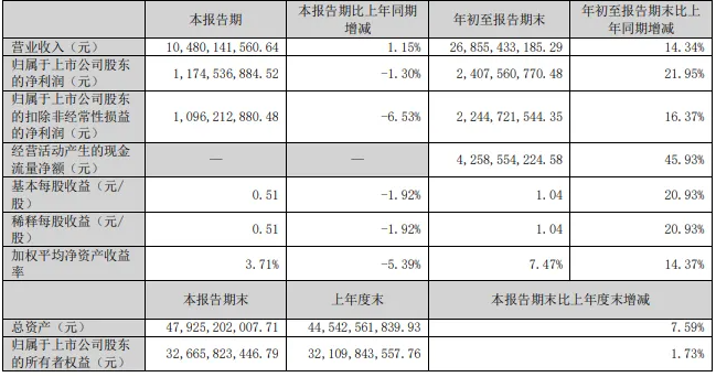 鵬鼎控股2025年第三季度營收為104.80億元,同比增長1.15%;凈利潤為11.75億元,同比下降1.30%。前三季度營收為268.55億元,同比增長14.34%;凈利潤為24.08億元,同比增長21.95%。