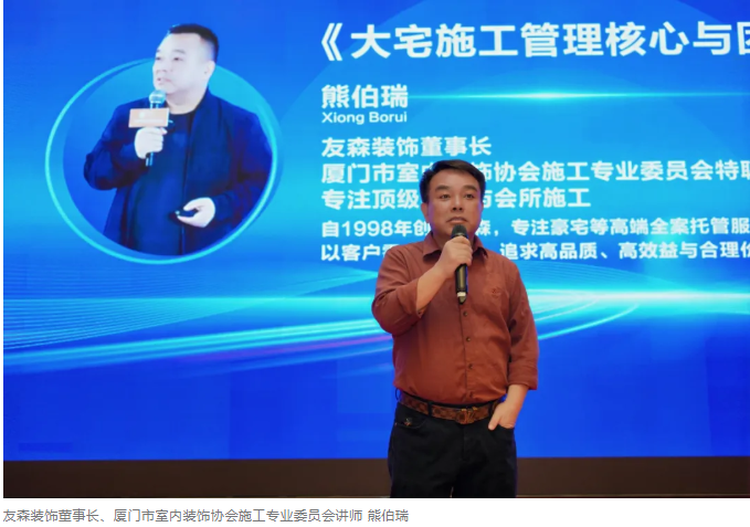 在主題演講環(huán)節(jié),長期以專注高端大宅與會所施工的行業(yè)專家,友森裝飾董事長、廈門市室內(nèi)裝飾協(xié)會施工專業(yè)委員會講師熊伯瑞指出,裝飾裝修行業(yè)門檻較低,創(chuàng)業(yè)者在當下迎來不穩(wěn)定時代,裝修人應(yīng)該堅定使命觀、愿景觀、價值觀一切只為客戶的最好體驗,主動推動裝修行業(yè)良性發(fā)展。