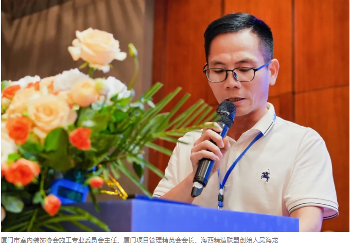 廈門市室內(nèi)裝飾協(xié)會施工專業(yè)委員會主任、廈門項目管理精英會會長、海西精造聯(lián)盟創(chuàng)始人吳海龍對本次大會致辭,對海西精造聯(lián)盟的創(chuàng)立愿景、行業(yè)發(fā)展趨勢、高質(zhì)量發(fā)展目標做了深度剖析,并宣布海西精造聯(lián)盟啟動儀式正式開始。