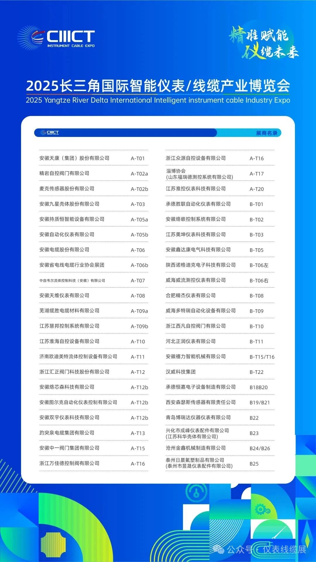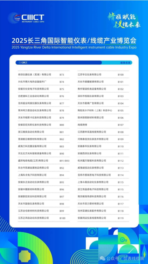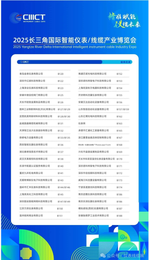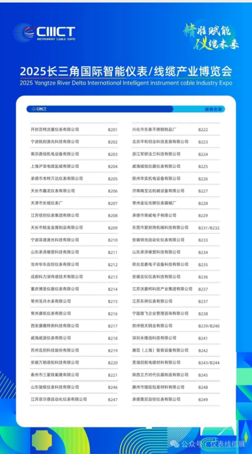 為了幫助您在這場盛會中事半功倍,直擊核心,我們特意整理了2025年長三角智能儀表/線纜產(chǎn)業(yè)博覽重點(diǎn)參展企業(yè)名錄及其展位號。