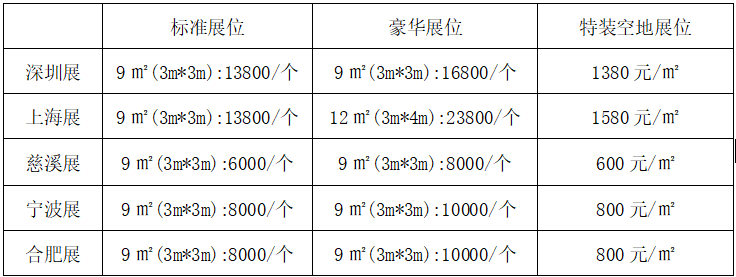 1、展覽收費(fèi):(雙開口標(biāo)準(zhǔn)展位加收10%)