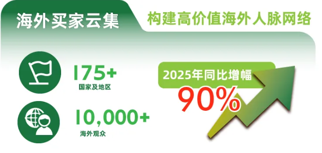 2026年,展會(huì)海外勢(shì)能將再升級(jí),我們預(yù)計(jì)精準(zhǔn)邀約11,000+海外的專業(yè)買家,覆蓋全球核心市場(chǎng):美國、加拿大、意大利、波蘭、法國、德國、西班牙、白俄羅斯、英國、俄羅斯、韓國、日本、新加坡、馬來西亞、泰國、越南、印度尼西亞、菲律賓、柬埔寨、印度、巴基斯坦、阿拉伯聯(lián)合酋長國、沙特阿拉伯等國家及地區(qū)買家,讓企業(yè)與海外買家面對(duì)面,高效打通全球化市場(chǎng)渠道。