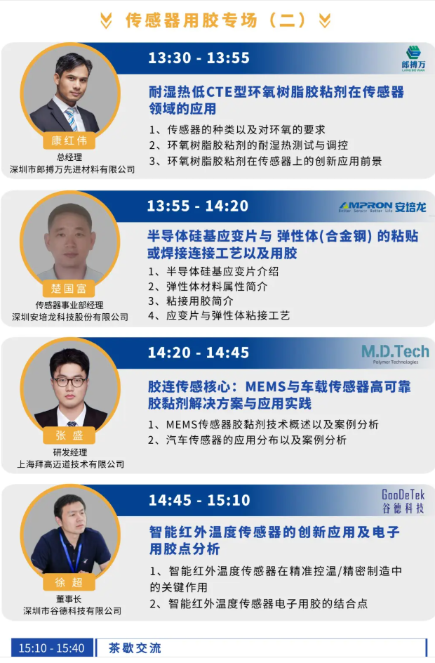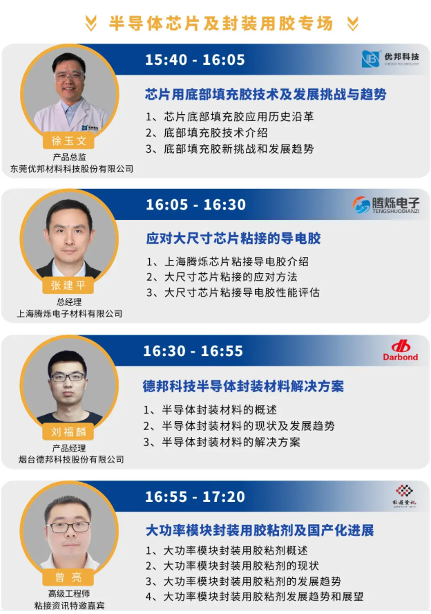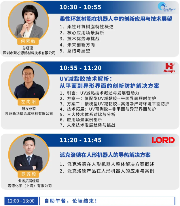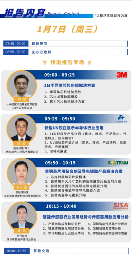 本次論壇將重點(diǎn)圍繞半導(dǎo)體、傳感器、機(jī)器人、低空經(jīng)濟(jì)等新興高端電子用膠方向邀請(qǐng)報(bào)告。仍有多篇報(bào)告在邀請(qǐng)確認(rèn)中,歡迎從事相關(guān)研究的企業(yè)和院校、機(jī)構(gòu)踴躍聯(lián)系報(bào)告演講,報(bào)告發(fā)言聯(lián)系方式:張老師 136671899191(同微)。部分已確認(rèn)報(bào)告如下: