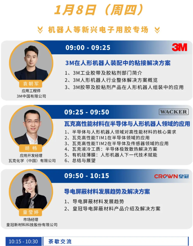 3M/ITW/波士膠/瓦克/洛德/綜研/賀利氏/旭川/康達(dá)/德邦/晶華/皇冠/之江/優(yōu)邦/首騁/三沃/徽氏/艾布納/拜高邁道/優(yōu)寶/尤尼威爾/松耀/鈞崴電子/博馳電子/津肅/卡夫特/瑞洋安泰/硅創(chuàng)/勇泰運(yùn)/航天化學(xué)/長(zhǎng)榮化工/博楓/密煉/運(yùn)銳/太亦/華為/新凱來(lái)/匯川/韶音/意法半導(dǎo)體/森霸/科敏/漢威/和而泰/威星國(guó)際等高端電子用膠產(chǎn)業(yè)的巨頭名企精英代表已報(bào)名參會(huì)!