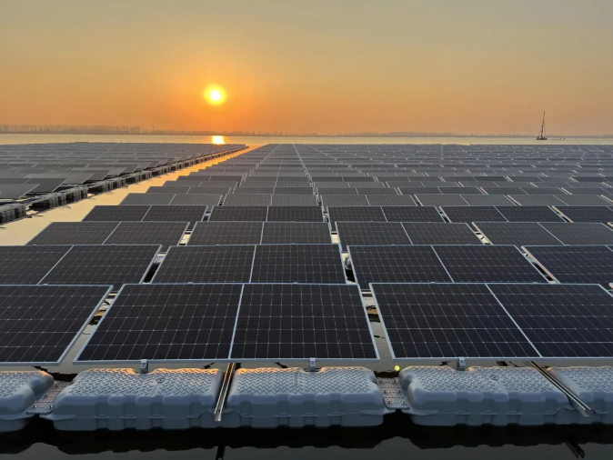 近日,位于安徽省淮南市丁集礦采煤沉陷區(qū)5300畝的水面上,37.28萬片藍(lán)色光伏板整齊排列,在陽光照射下與波光粼粼的水面交相輝映,格外壯麗。