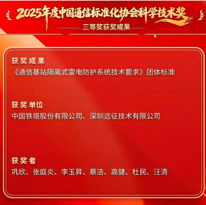 2026年1月22日,中國(guó)通信標(biāo)準(zhǔn)化協(xié)會(huì)正式公布2025年度科學(xué)技術(shù)獎(jiǎng)。由我會(huì)副會(huì)長(zhǎng)單位深圳遠(yuǎn)征技術(shù)有限公司(以下簡(jiǎn)稱“深圳遠(yuǎn)征”)與中國(guó)鐵塔股份有限公司(以下簡(jiǎn)稱“中國(guó)鐵塔”)聯(lián)合牽頭編制的《通信基站隔離式雷電防護(hù)系統(tǒng)技術(shù)要求》(T/CAICI 4-2018)團(tuán)體標(biāo)準(zhǔn),榮獲科學(xué)技術(shù)獎(jiǎng)三等獎(jiǎng)。