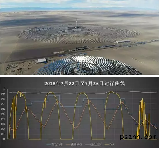 黃文博介紹,今年7月,敦煌有7天為多云天氣,電站在部分時段冷鹽上塔集熱,5天為完全陰天,完全未上塔集熱,其余19天為晴天,熔鹽完全上塔集熱。在這一個月中,共加熱熱鹽151小時,加熱冷鹽44小時。