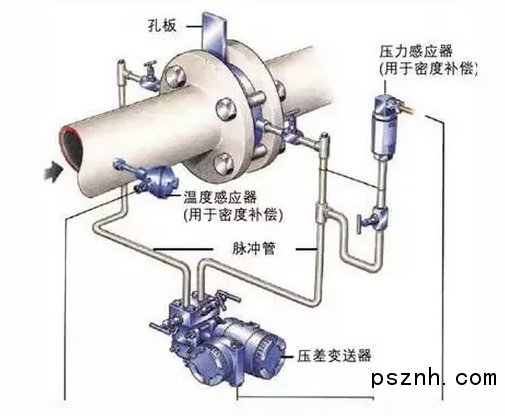 通過引壓管將差壓信號引入差壓變送器,差壓變送器將差壓信號送入流量積算儀,積算儀將差壓信號換算成流量信號。同時通過溫度和壓力傳感器測出蒸汽的溫度和壓力,積算儀根據(jù)當時的溫度和壓力計算出補償后的流量。