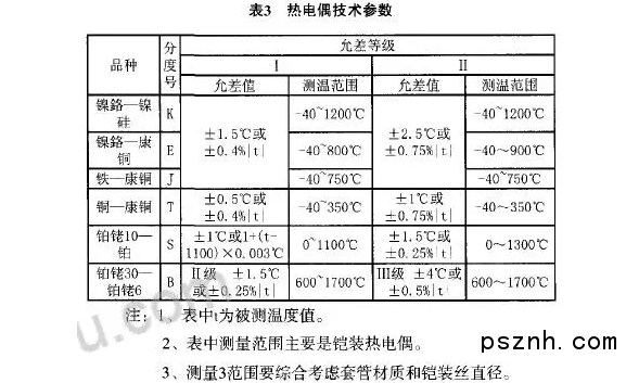 以上詳細介紹了工業(yè)測量中常用幾種熱電偶的性能,實際使用中用戶還有其它不同分度號的熱電偶可選擇,如表3所示,統(tǒng)計了熱電偶的相關(guān)技術(shù)參數(shù),供大家選型時參考。