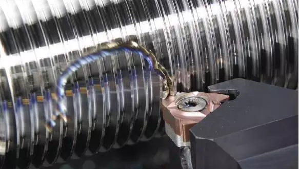 在數(shù)控切削過程中,切削碎屑很容易牢固地粘附或熔著在刀尖和刀刃上,形成積屑瘤,造成工件加工表面的表面粗糙度惡化,同時增加切削過程中的振動,加速刀具磨損。而且大量的切削熱無法及時傳導出來,甚至切削產(chǎn)生的熱量也無法傳導到切屑的整體上,造成傳入刀具總熱量比普通碳素鋼多3~5倍,使切削刃在高溫下失去切削性能。在數(shù)控切削過程中,所產(chǎn)生的大量熱能未能迅速排出,必然會傳遞給刀具,使切削部位溫度升高。同時由于排屑比較困難,尤其是不斷屑,使被切削下來的切屑產(chǎn)生擠塞,特別是加工內孔,切屑擠塞更加嚴重。另外,刀具因受螺紋截面形狀的限制,再加之本身強度較差,加工中容易產(chǎn)生振動,刀尖很容易在切削過程中由于局部溫度過高而燒壞或因振動太大而崩裂。