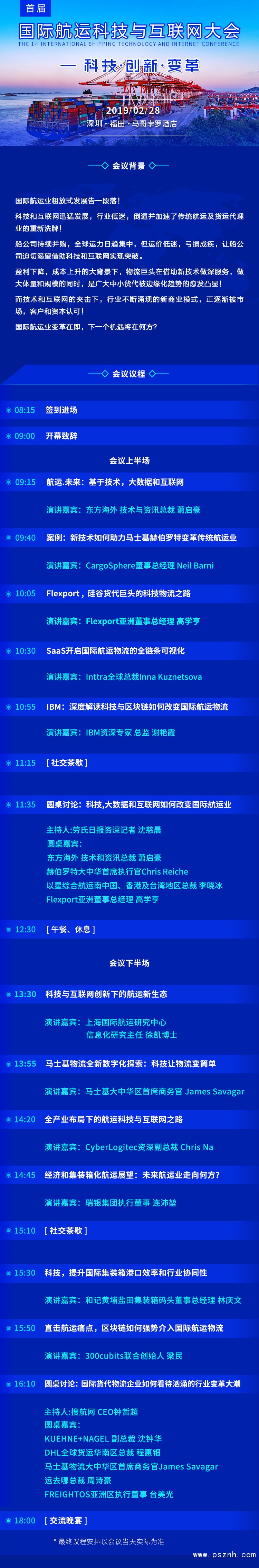 包括馬士基,東方海外,赫伯羅特在內(nèi)的多家全球知名班輪公司,包括德迅,DHL及Damco在內(nèi)的全球物流巨頭,包括IBM,Inttra,Wishtech和300Cubits在內(nèi)的航運(yùn)科技企業(yè),將在此次大會上分享他們在航運(yùn)科技與互聯(lián)網(wǎng)方面的新探索,以及對未來行業(yè)趨勢的觀點(diǎn)。