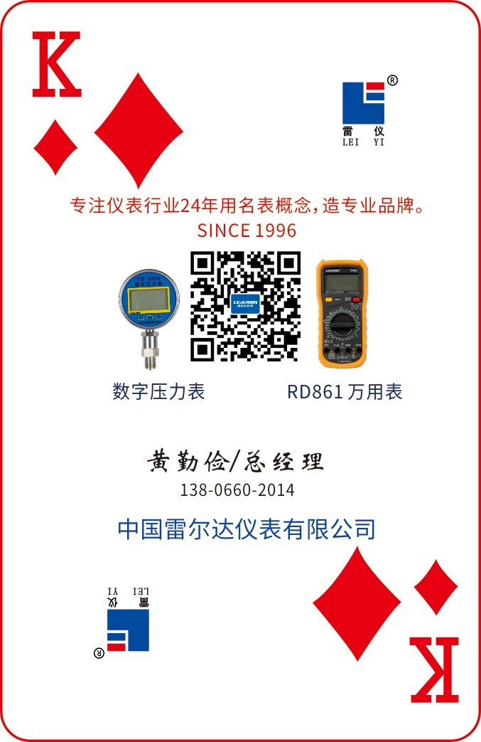 《2020圖頁儀表行業(yè)撲克牌》推出就得到雷爾達儀表有限公司黃勤儉總經(jīng)理的認同和支持,黃總雷爾達儀表積極認領了方塊K做為此次的公司的專屬牌!
