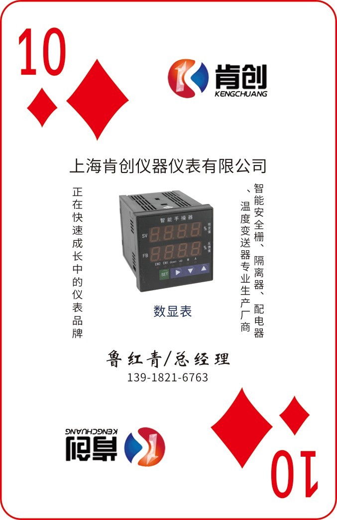 《2020圖頁(yè)儀表行業(yè)撲克牌》推出就得到 上??蟿?chuàng)儀器儀表有限公司總經(jīng)理魯紅青的認(rèn)同和支持,上??蟿?chuàng)積極認(rèn)領(lǐng)了黑桃10做為此次的公司的專屬牌!
