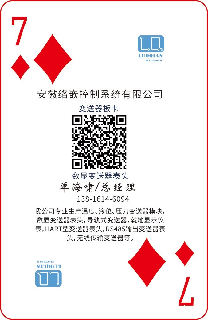 《2020圖頁(yè)儀表行業(yè)撲克牌》推出就得到  安徽絡(luò)嵌控制系統(tǒng)有限公司總經(jīng)理 單海嘯的認(rèn)同和支持, 安徽絡(luò)嵌控制系統(tǒng)積極認(rèn)領(lǐng)了方塊7作為此次的公司的專(zhuān)屬牌!