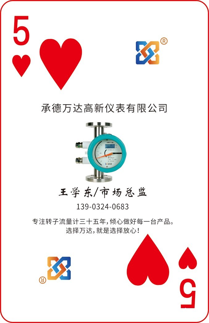 《2020圖頁儀表行業(yè)撲克牌》推出就得到 承德萬達高新儀表有限公司總經(jīng)理王學東的認同和支持,王總的承德萬達高新積極認領(lǐng)了紅桃5做為此次的公司的專屬牌!