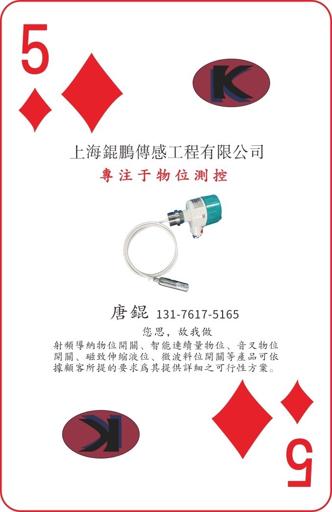 《2020圖頁儀表行業(yè)撲克牌》推出就得到上海錕鵬傳感工程有限公司總經(jīng)理唐錕的認(rèn)同和支持,唐總的上海錕鵬傳感工程積極認(rèn)領(lǐng)了方塊5做為此次的公司的專屬牌!