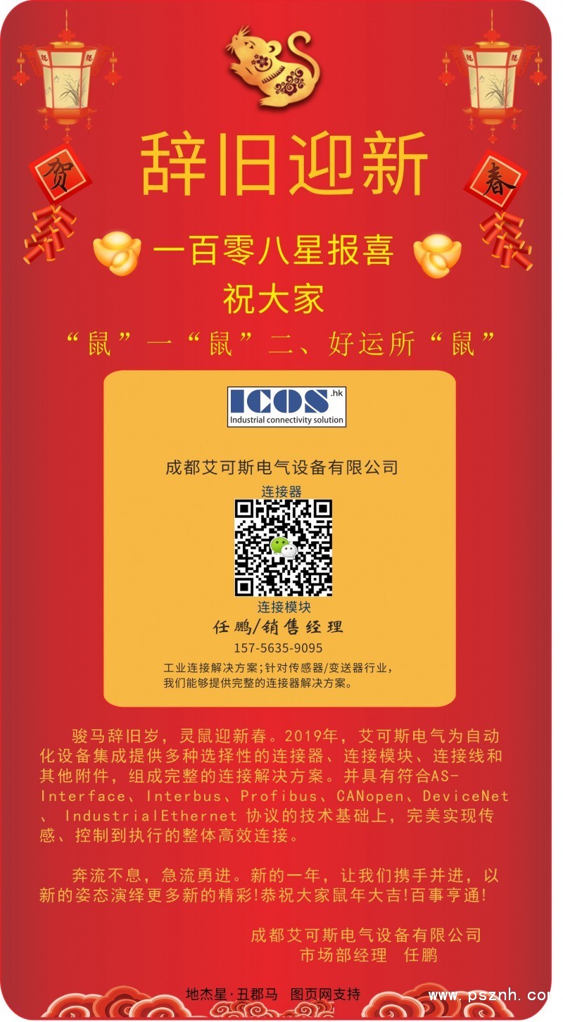 駿馬辭舊歲,靈鼠迎新春。2019年,艾可斯電氣為自動化設(shè)備集成提供多種選擇性的連接器、連接模塊、連接線和其他附件,組成完整的連接解決方案。并具有符合AS-Interface、Interbus、Profibus、CANopen、DeviceNet、 IndustrialEthernet 協(xié)議的技術(shù)基礎(chǔ)上,完美實現(xiàn)傳感、控制到執(zhí)行的整體高效連接。