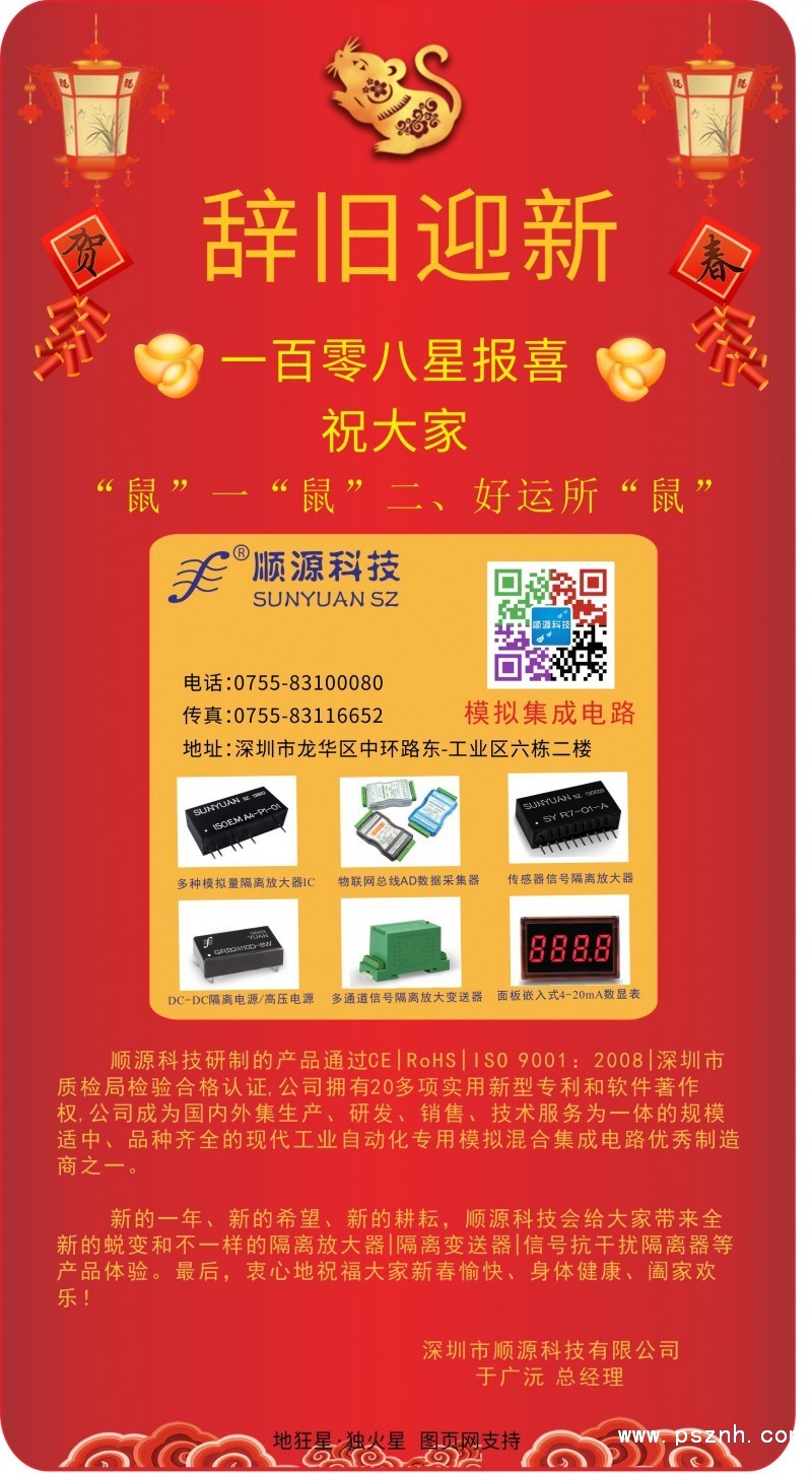 新的一年、新的希望、新的耕耘,順源科技會(huì)給大家?guī)砣碌耐懽兒筒灰粯拥母綦x放大器|隔離變送器|信號(hào)抗干擾隔離器等產(chǎn)品體驗(yàn)。最后,衷心地祝福大家新春愉快、身體健康、闔家歡樂!