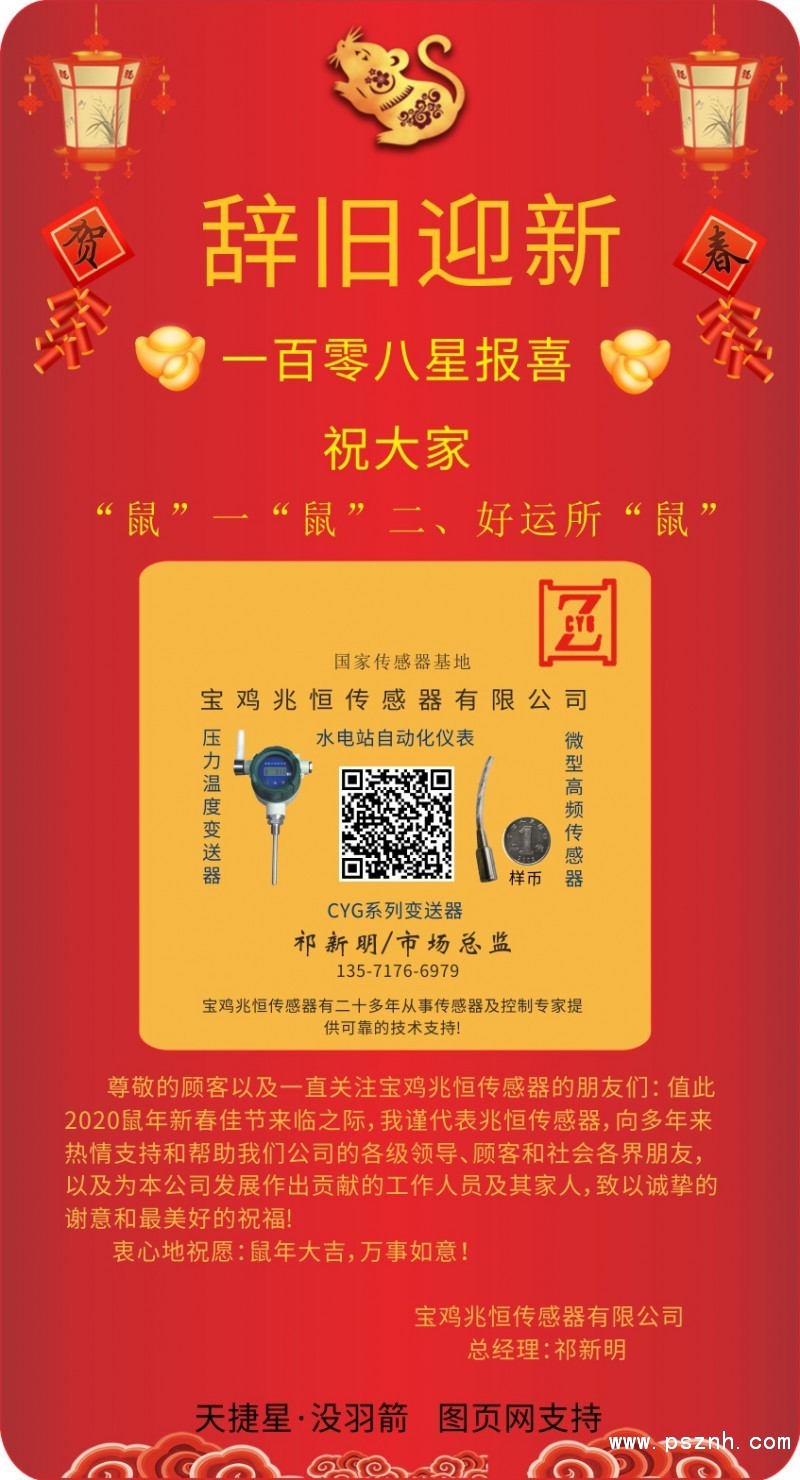 尊敬的顧客以及一直關(guān)注寶雞兆恒傳感器的朋友們: 值此2020鼠年新春佳節(jié)來臨之際,我謹(jǐn)代表兆恒傳感器,向多年來熱情支持和幫助我們公司的各級(jí)領(lǐng)導(dǎo)、顧客和社會(huì)各界朋友,以及為本公司發(fā)展作出貢獻(xiàn)的工作人員及其家人,致以誠(chéng)摯的謝意和最美好的祝福!