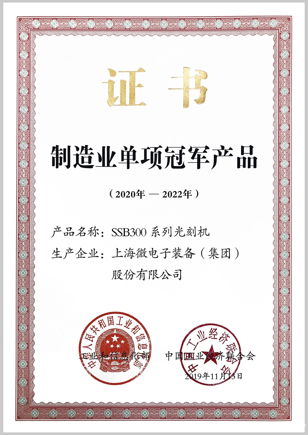 上海微電子裝備SSB300系列光刻機入選制造業(yè)單項冠軍產品