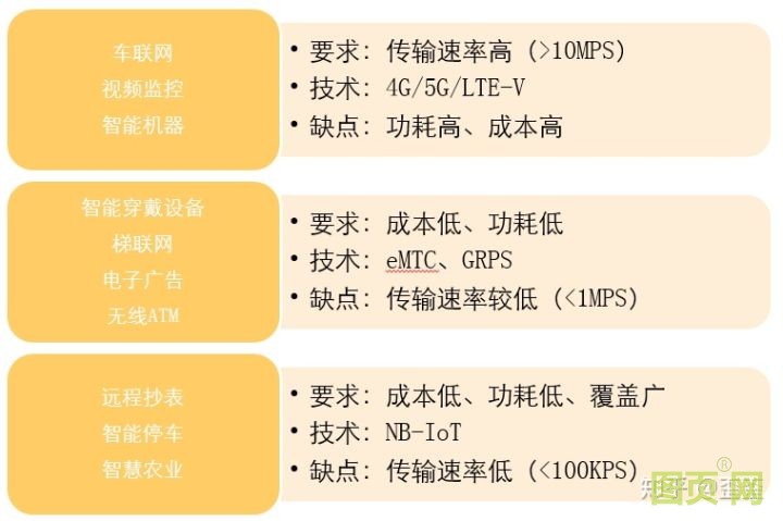 ——NB-IOT:構(gòu)建于蜂窩通信的窄帶物聯(lián)網(wǎng),只消耗大約180KHZ的帶寬,可直接部署于GAM網(wǎng)絡、UMTS網(wǎng)絡、LTE網(wǎng)絡以降低部署成本,實現(xiàn)平滑升級。聚焦于低功耗廣域網(wǎng)市場,覆蓋廣、連接多、速率低、成本低、功耗低、價格優(yōu)的特點,可用于遠程抄表、資產(chǎn)追蹤、只能停車、智慧農(nóng)業(yè)等。