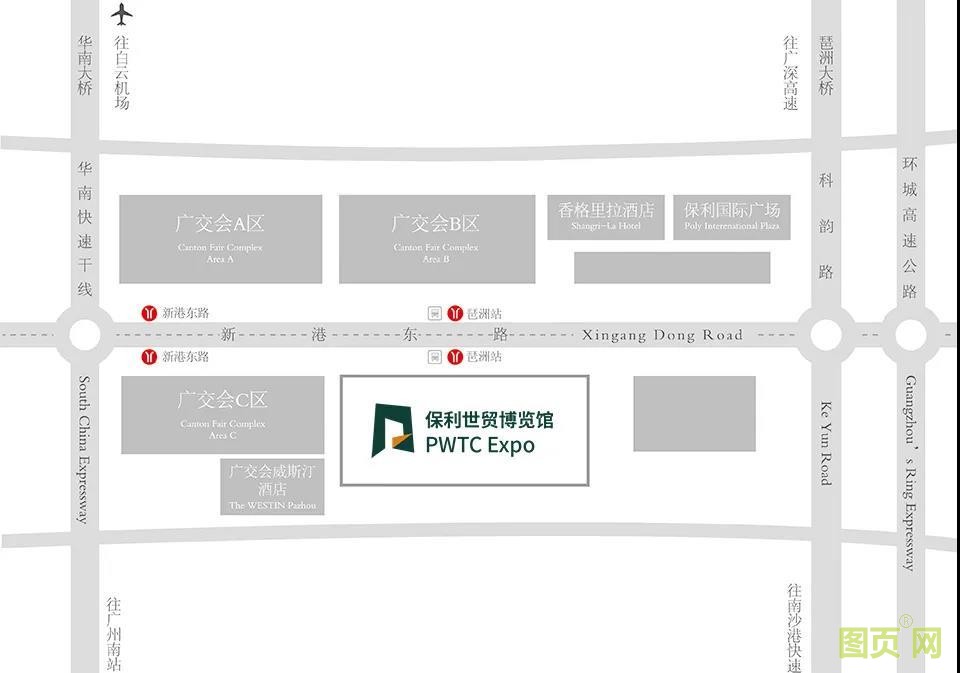 保利世貿(mào)博覽館坐落于廣州海珠區(qū)琶洲會展商圈核心地帶。地鐵8號線可直達(dá)展廳入口,其“琶洲站”與博覽館無縫接駁。路面交通網(wǎng)絡(luò)快捷方便,東臨環(huán)城高速,西接華南快速干線,北接新港東路,南接鳳浦中路,還有多條公交線路交匯于此,可快速到達(dá)廣州火車站、廣州東站、廣州南站、天河客運(yùn)站和白云國際機(jī)場。