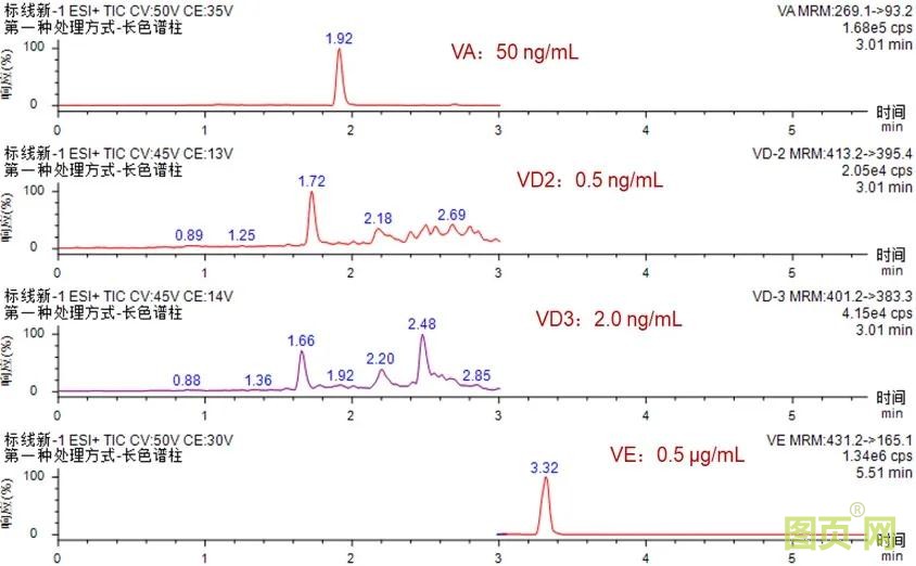 EXPEC 5210 針對(duì)維生素ADE的檢測(cè)采用梯度洗脫條件,在縮短分析時(shí)間的同時(shí)獲得了較好的去介質(zhì)及分離效果,一針進(jìn)樣可得到VA、25-OH-VD2、25-OH-VD3、VE檢測(cè)結(jié)果,滿足臨床的高通量需求。同時(shí)在前處理過程中添加同位素內(nèi)標(biāo)后,消除了不同基質(zhì)樣本中內(nèi)源性物質(zhì)對(duì)檢測(cè)物的影響,大大提高了檢測(cè)結(jié)果的準(zhǔn)確性。