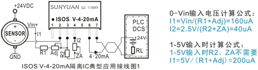 ISO V-4-20mA(SIP12 Pin)和ISOS V-4-20mA(SIP 7Pin)無(wú)源型V/I轉(zhuǎn)換模擬信號(hào)隔離變送器,是一種電壓輸入、兩線制電流輸出回路供電的信號(hào)隔離變送模塊。通過(guò)后級(jí)電流回路饋電方式,給輸入端提供一組5V(3mA)功能拓展電源給前級(jí)設(shè)備供電,并接收來(lái)自前級(jí)設(shè)備輸出的電壓信號(hào),經(jīng)模塊隔離后輸出4~20mA的標(biāo)準(zhǔn)兩線制電流信號(hào)。本方案采用獨(dú)有的電磁隔離模式及高效能后級(jí)饋電技術(shù),實(shí)現(xiàn)電壓信號(hào)到4-20mA 標(biāo)準(zhǔn)信號(hào)的精準(zhǔn)隔離轉(zhuǎn)換,可與各種儀表的模擬量輸入端口(如PLC、DCS 系統(tǒng)等)相匹配。該技術(shù)方案使用十分方便,無(wú)需外加任何器件,即可實(shí)現(xiàn)電壓信號(hào)輸入、位移電位器等需配電型傳感器或電橋(稱重)檢測(cè)電路的電壓信號(hào)隔離變送。